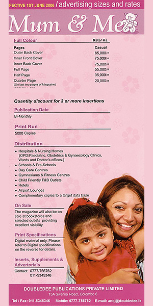 Mum & Me is the only Parenting magazine in Sri Lanka with the target audience being the female (between the age of 20-40) who is predominantly a parent or parent – to – be.